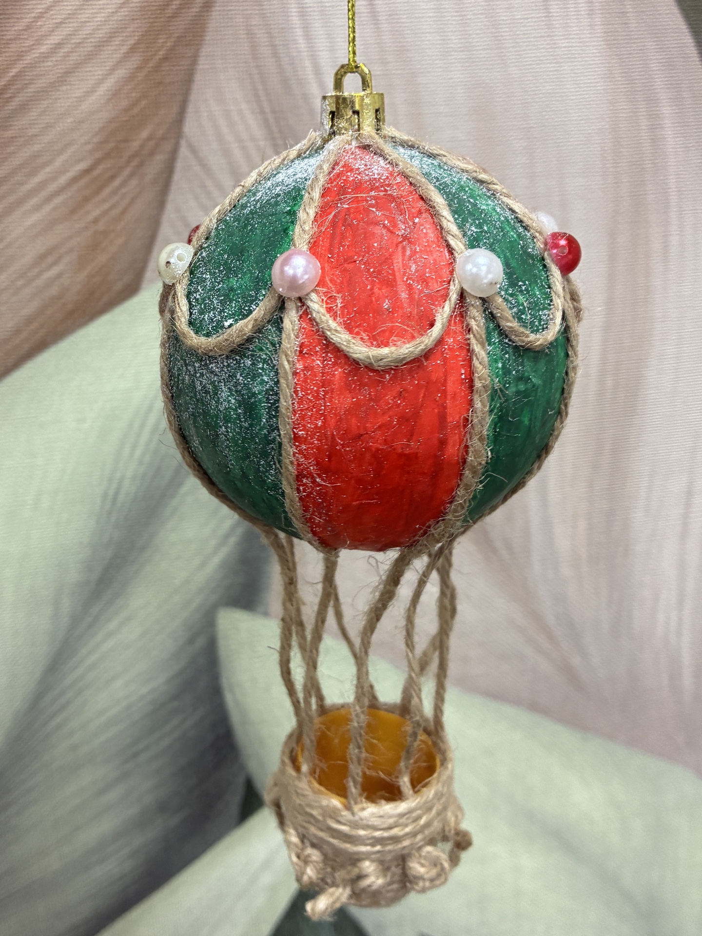 Описание: Новогодний шар в виде воздушного шара с корзинкой. Полностью ручная работа