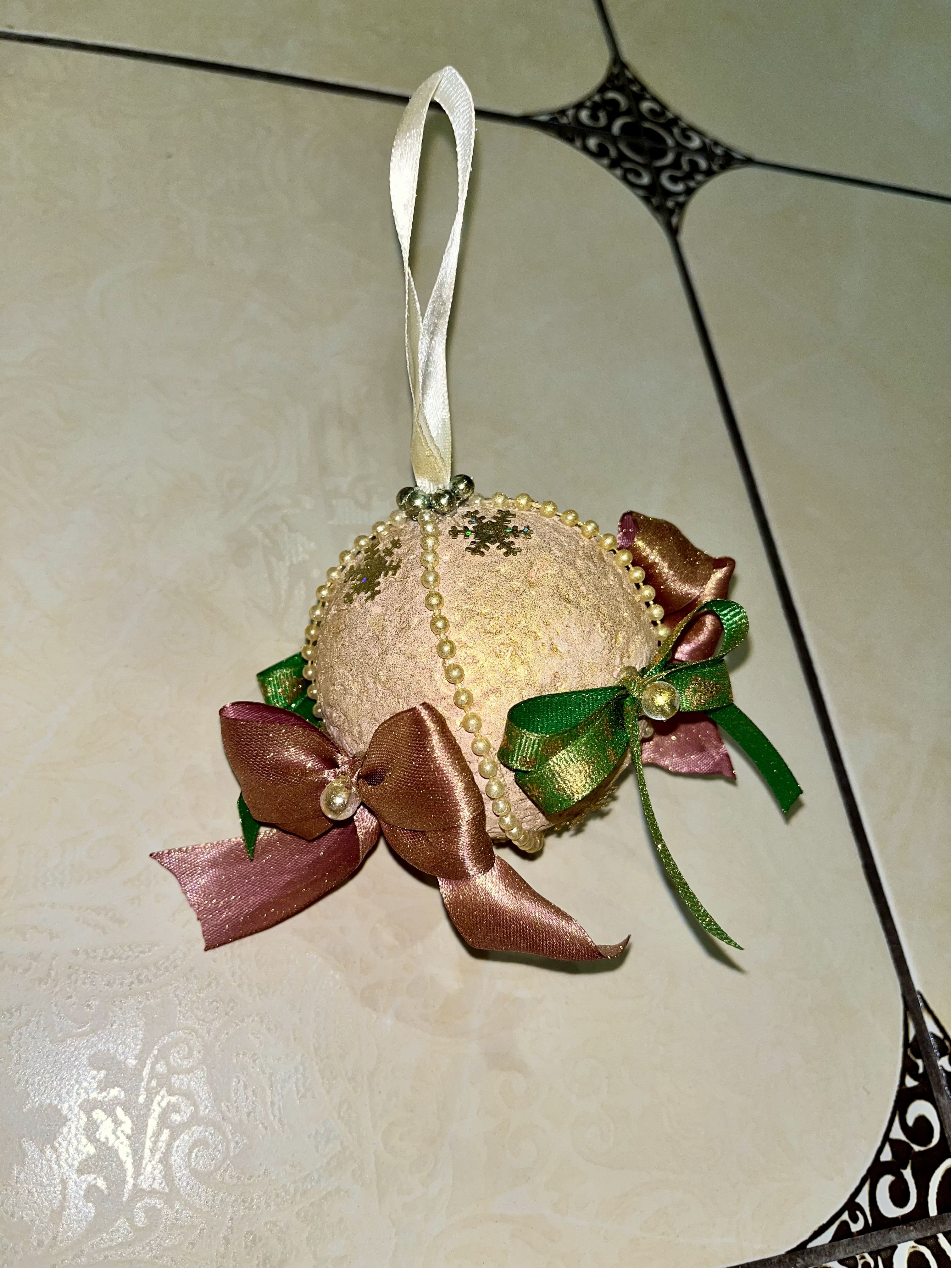 Описание: За основу елочного шара взят пенопласт круглой формы. Основа была покрашена гуашью, декорирована бантиками, бусинами и пайетками. Для сияния использовался спрей с блестками.